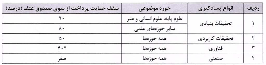 حقوق و مزایای ماهانه محقق پسادکتری معادل ۸۰ درصد حقوق و مزایای ماهانه استادیار پایه یک وزارت علوم، تحقیقات و فناوری است که حداکثر سهم صندوق عتف برای انواع پسادکتری بر اساس جدول زیر توسط کارگروه تعیین میشود. بدیهی است مابه التفاوت مبلغ حقوق و مزایای ماهانه تا سقف مقرر را باید مؤسسه/ مرکز فناوری/ واحد صنعتی در ابتدای هر سه ماه پرداخت کند.