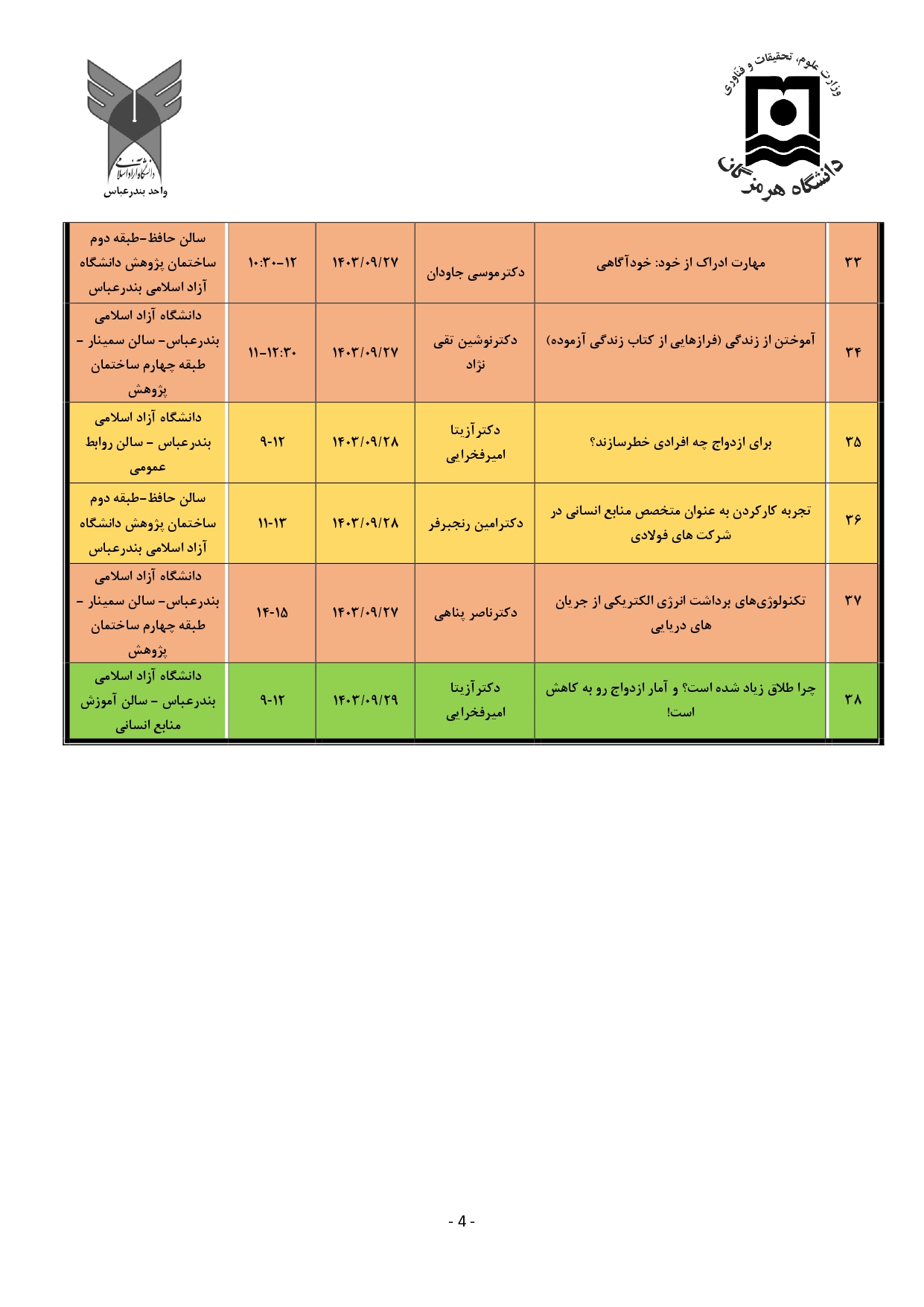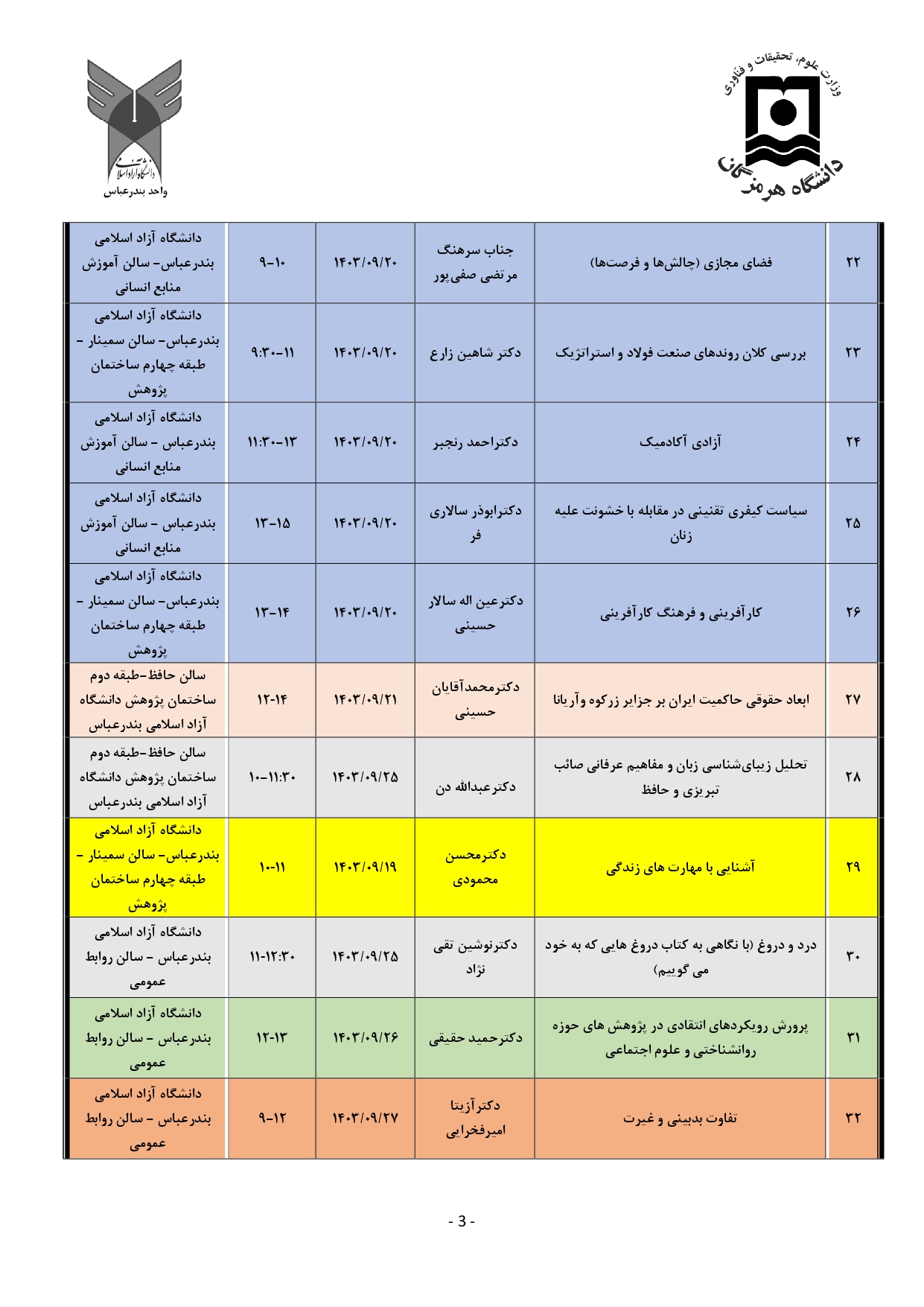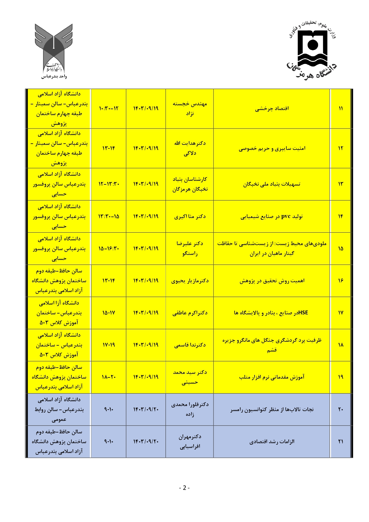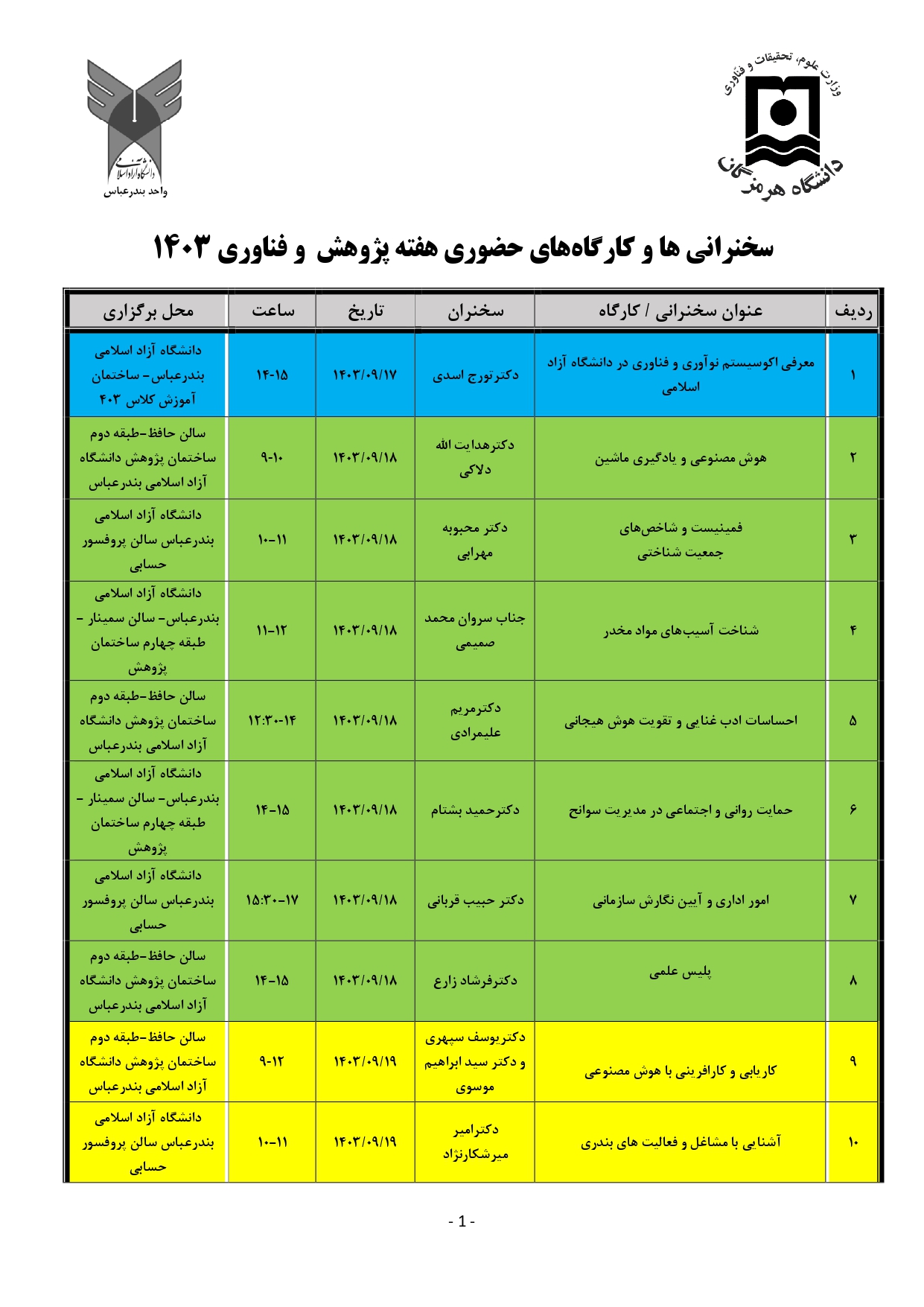 برنامه زمانبندی سخنرانی ها و کارگاه های حضوری هفته پژوهش و فناوری 1403