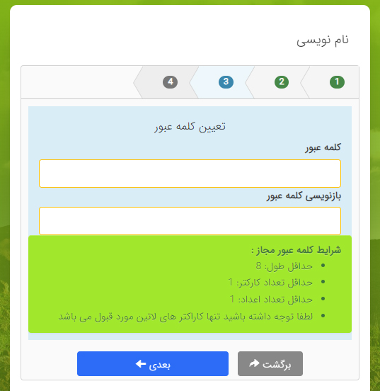 5- تعریف نمودن کلمه عبور توسط خود شخص (حداقل 8 کاراکتر)