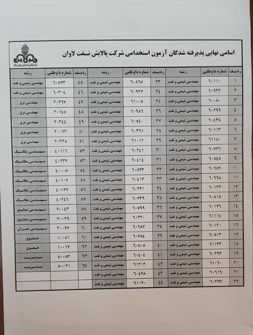 نتایج مرحله مصاحبه آزمون استخدامی شرکت پالایش نفت لاوان