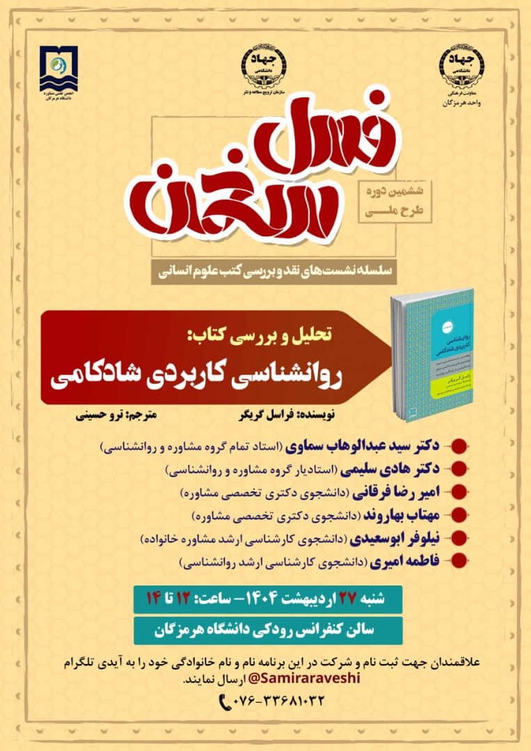 دعوت به حضور در ششمین دوره طرح ملی فصل سخن: تحلیل و بررسی کتاب «روانشناسی کاربردی شادکامی» در دانشگاه هرمزگان