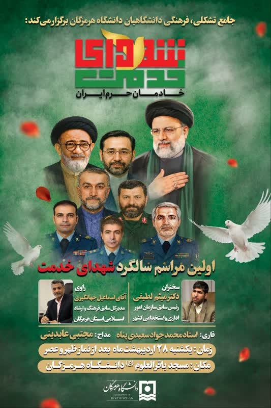 «یادمان مردان میدان»؛ نخستین مراسم گرامیداشت «شهید سید ابراهیم رئیسی و شهدای خدمت» در دانشگاه هرمزگان برگزار می‌شود
