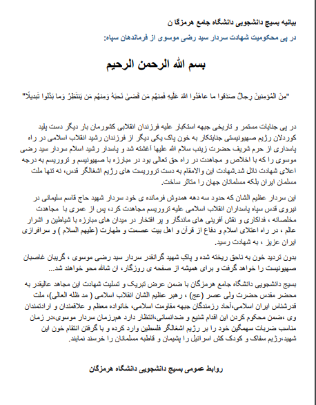 بیانیه بسیج دانشجویی دانشگاه جامع هرمزگان در پی محکومیت شهادت سردار سید رضی