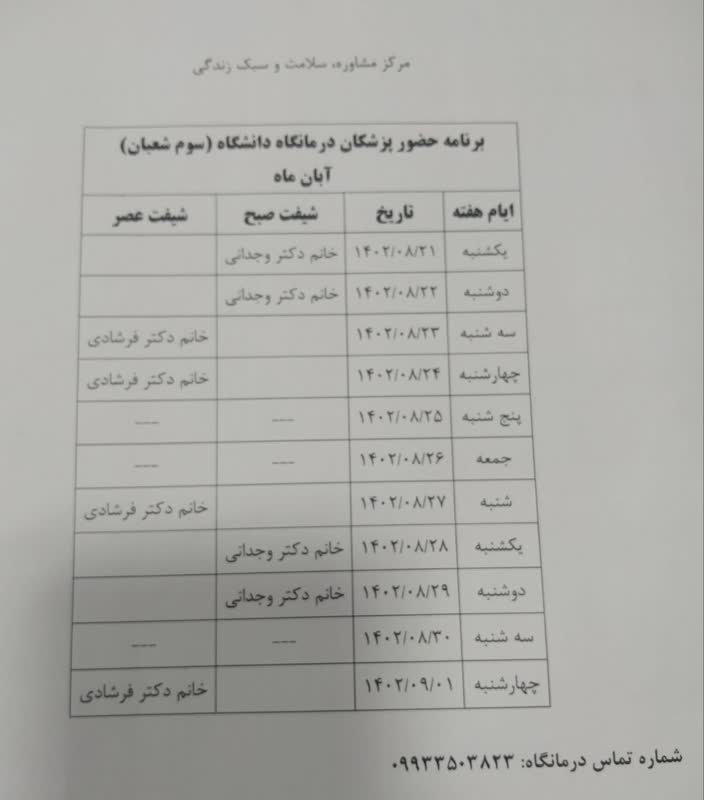 برنامه حضور پزشکان درمانگاه (سوم شعبان) در ماه آبان