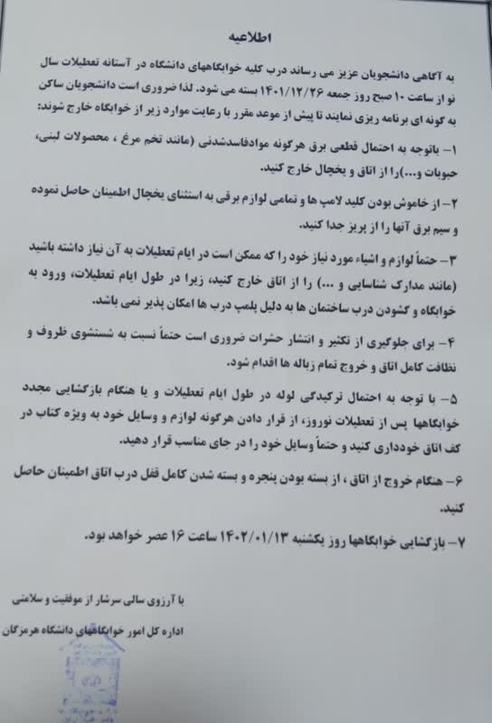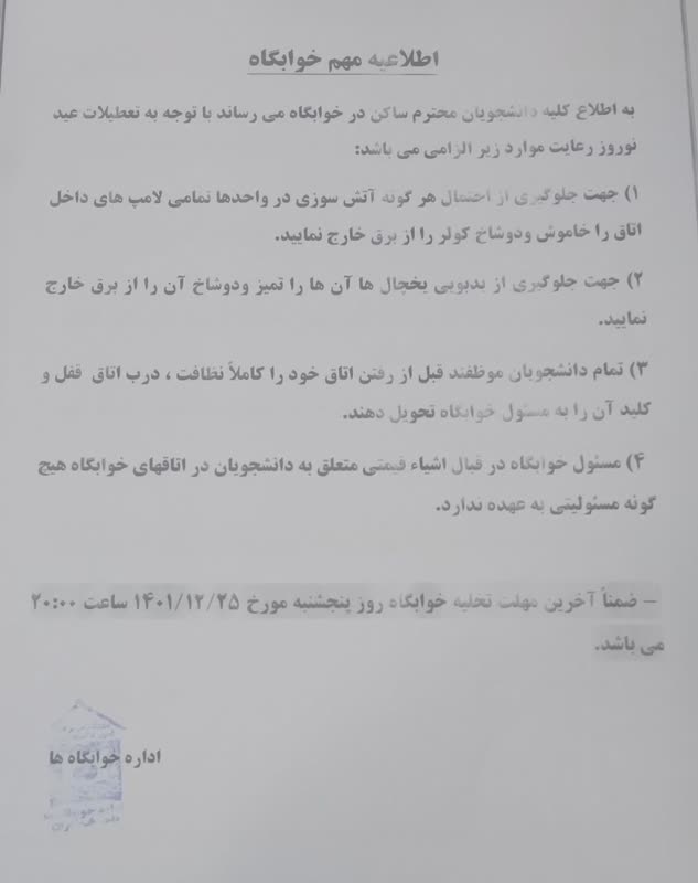 اطلاعیه مهم خوابگاه