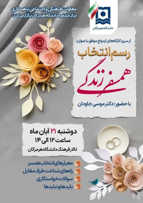 معاونت فرهنگی و اجتماعی با همکاری مرکز مشاوره،سلامت و سبک زندگی دانشگاه هرمزگان برگزار می نماید.
