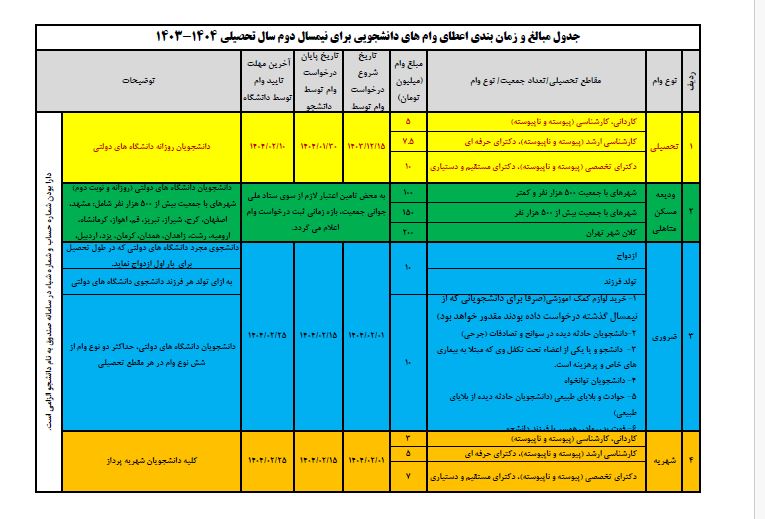 لازم به ذکر است فرایند ثبت تقاضای وام توسط دانشجویان از تاریخ 1403/12/15 لغایت 1404/02/15 در بازه‌های زمانی تعین شده برای هر وام مطابق جدول پیوست می‌باشد.