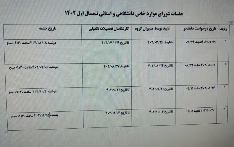 جدول جلسات شورای موارد خاص نیمسال اول 1402