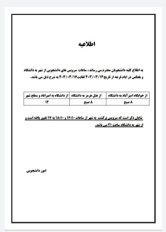 برنامه ساعات حرکت سرویس های دانشجویی در ایام فرجه