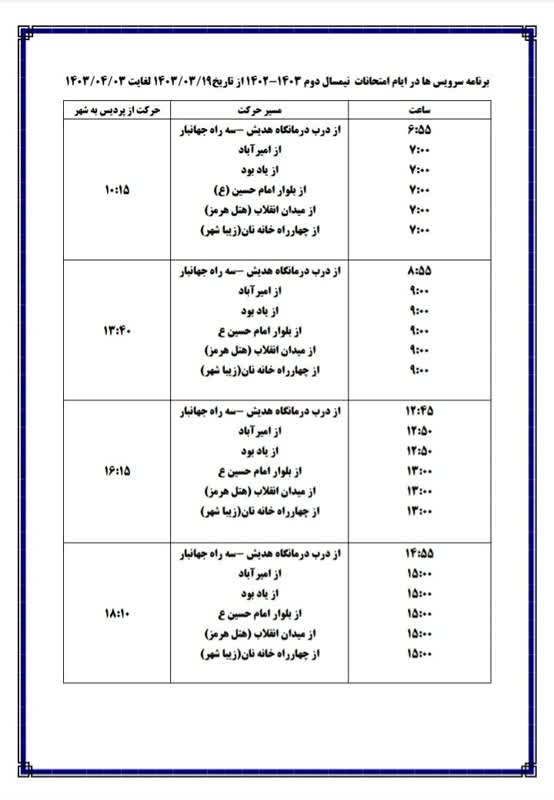 برنامه ساعات حرکت سرویس های دانشجویی در ایام امتحانات پایان ترم