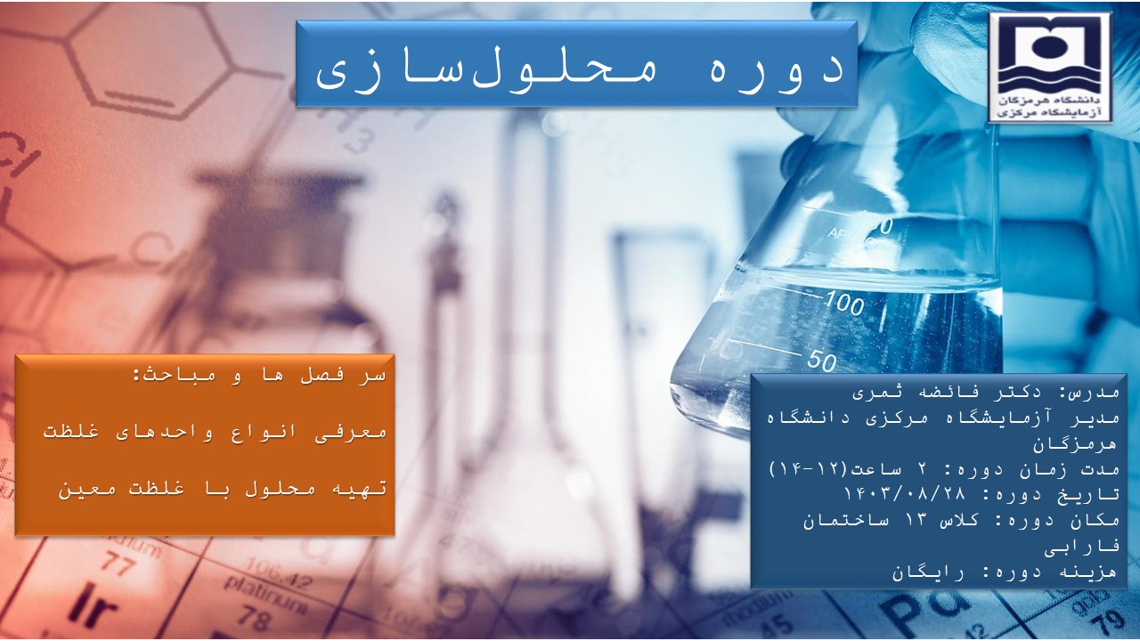 آزمایشگاه مرکزی در نظر دارد در راستای توانمندسازی دانشجویان، کارگاه محلول سازی را برگزار کند. به همین منظور اولین دوره در تاریخ 1403/08/28 روز دوشنبه ساعت 12-14 در کلاس 13 دانشکده فارابی برگزار می گردد.