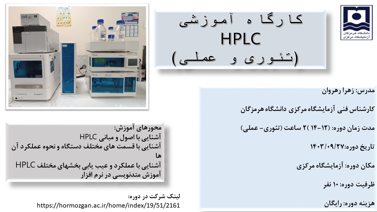 آزمایشگاه مرکزی در نظر دارد در راستای توانمندسازی دانشجویان، کارگاه آشنایی با اصول و کاربرد دستگاه HPLC را برگزار کند.