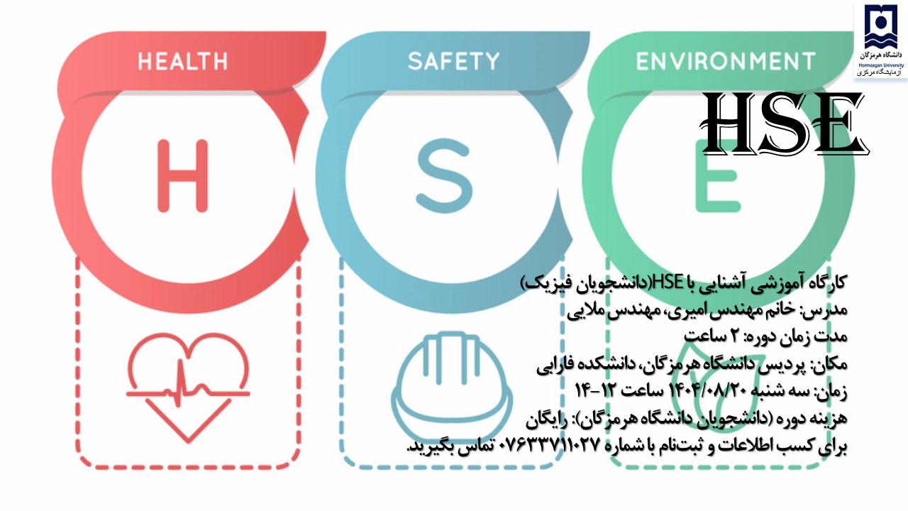 به اطلاع دانشجویان گرامی میرساند، آزمایشگاه مرکزی دانشگاه در راستای ارتقای سطح آگاهی و ایمنی در محیطهای آزمایشگاهی، دوره آموزشی "ایمنی در آزمایشگاه (HSE)" را ویژه دانشجویان جدیدالورود برگزار میکند.