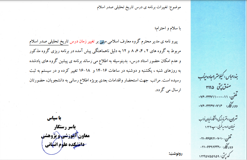 تغییر زمان درس تاریخ تحلیلی صدر اسلام گروههای درسی 2،4،6،8،12