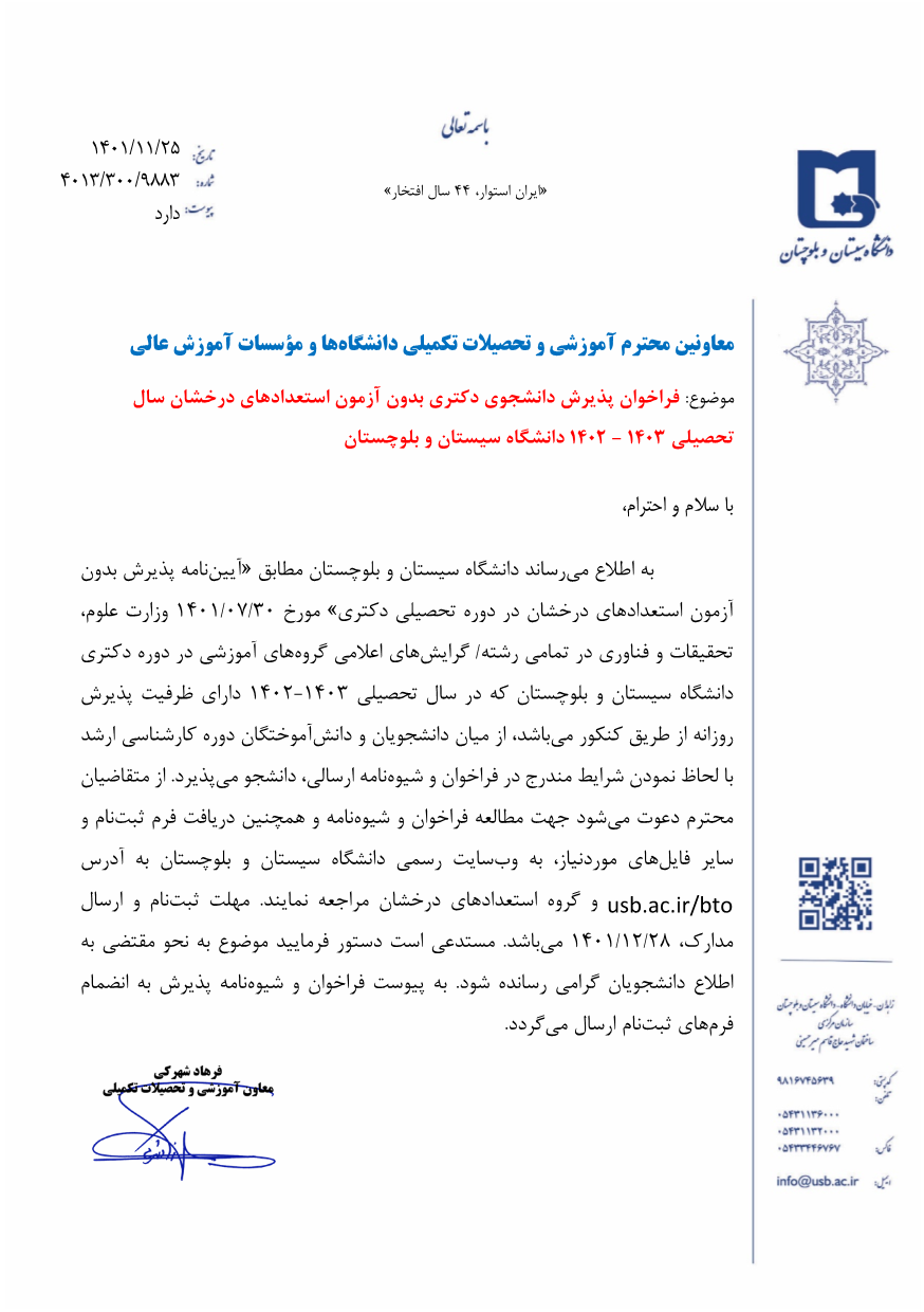 فراخوان پذیرش دانشجو بدون آزمون استعدادهای درخشان در دوره تحصیلی دکتری - دانشگاه سیستان و بلوچستان برای سال تحصیلی 1403-1402