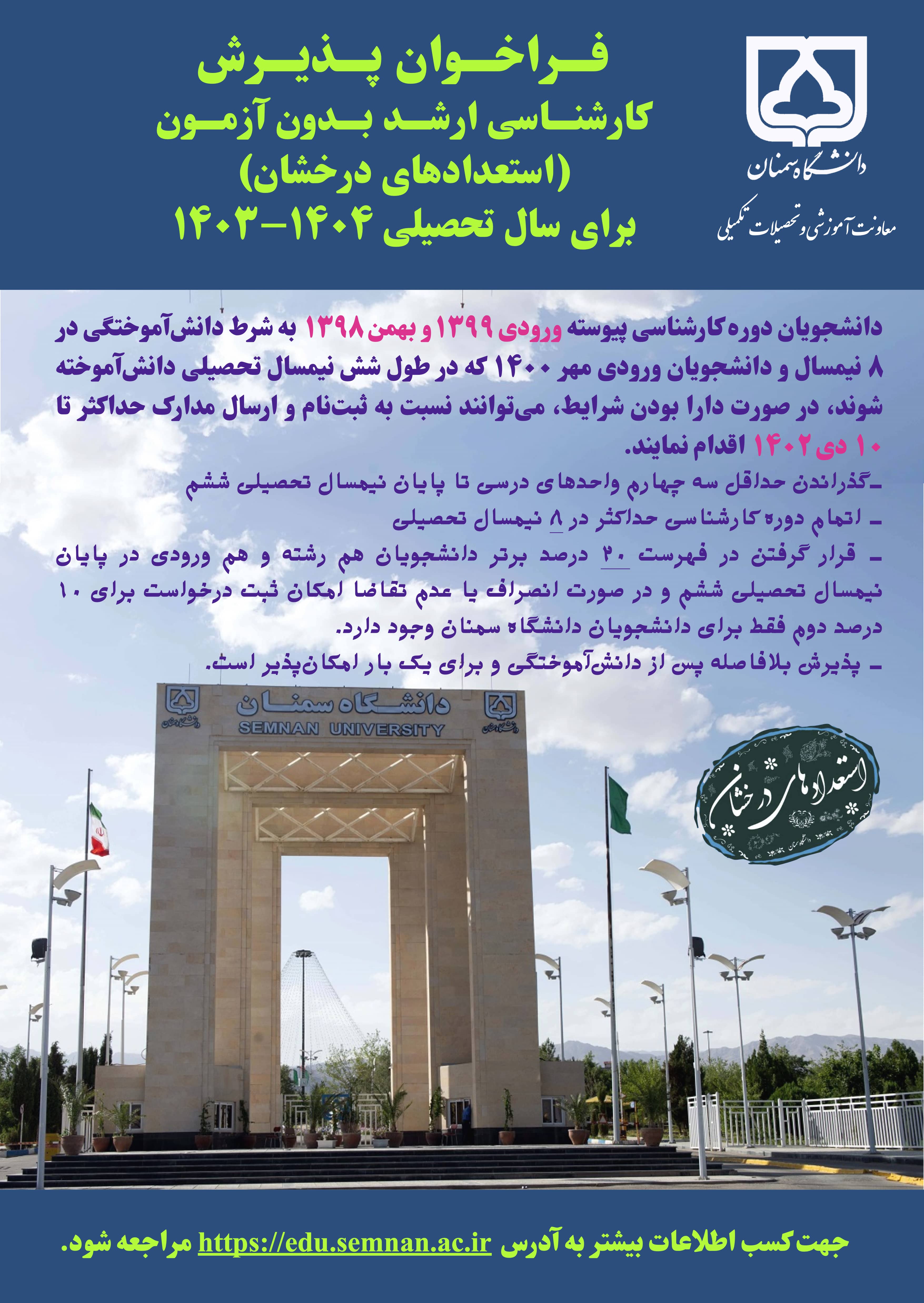 پذیرش بدون آزمون استعدادهای درخشان مقطع کارشناسی ارشد سال تحصیلی 04-1403 دانشگاه سمنان
