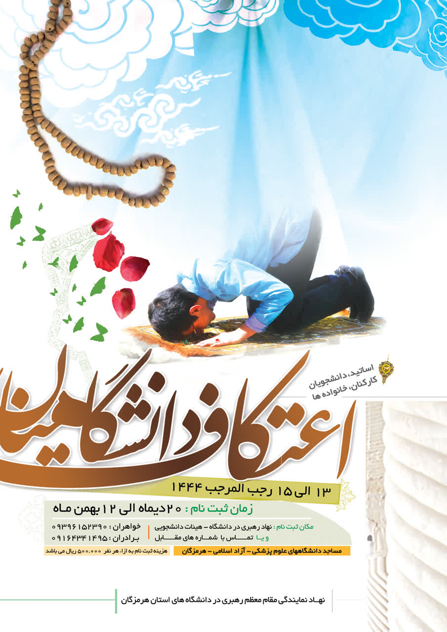 مراسم معنوی اعتکاف ویژه دانشجویان، اساتید، کارکنان و خانواده محترم اساتید و کارکنان از 13 تا 15 رجب المرجب 1444 (مصادف با 15 تا 17 بهمن‌ماه 1401) در مساجد دانشگاه‌های استان هرمزگان برگزار می‌شود.