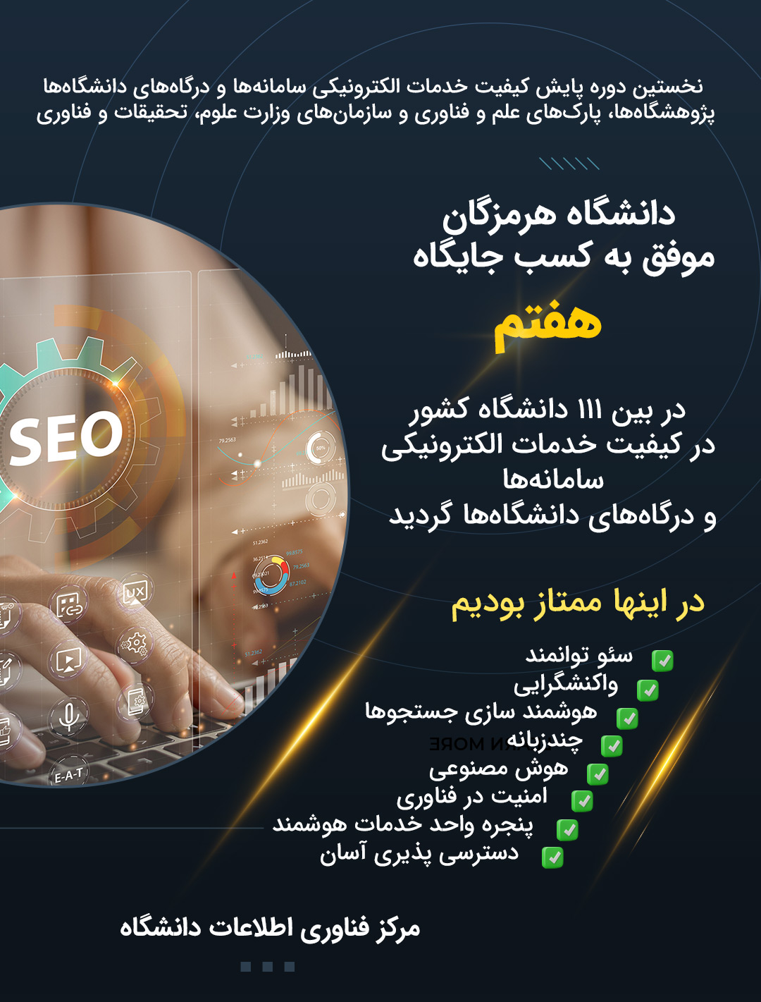 دانشگاه هرمزگان در نخستین ارزیابی پایش خدمات الکترونیکی، سامانه ها و درگاه ها موفق به کسب رتبه هفتم در بین 111 دانشگاه کشور شد