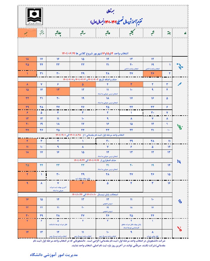 تقویم ثبت و تصویب پروپوزال و دفاع در نیمسال تحصیلی اول سال تحصیلی 1402-1401