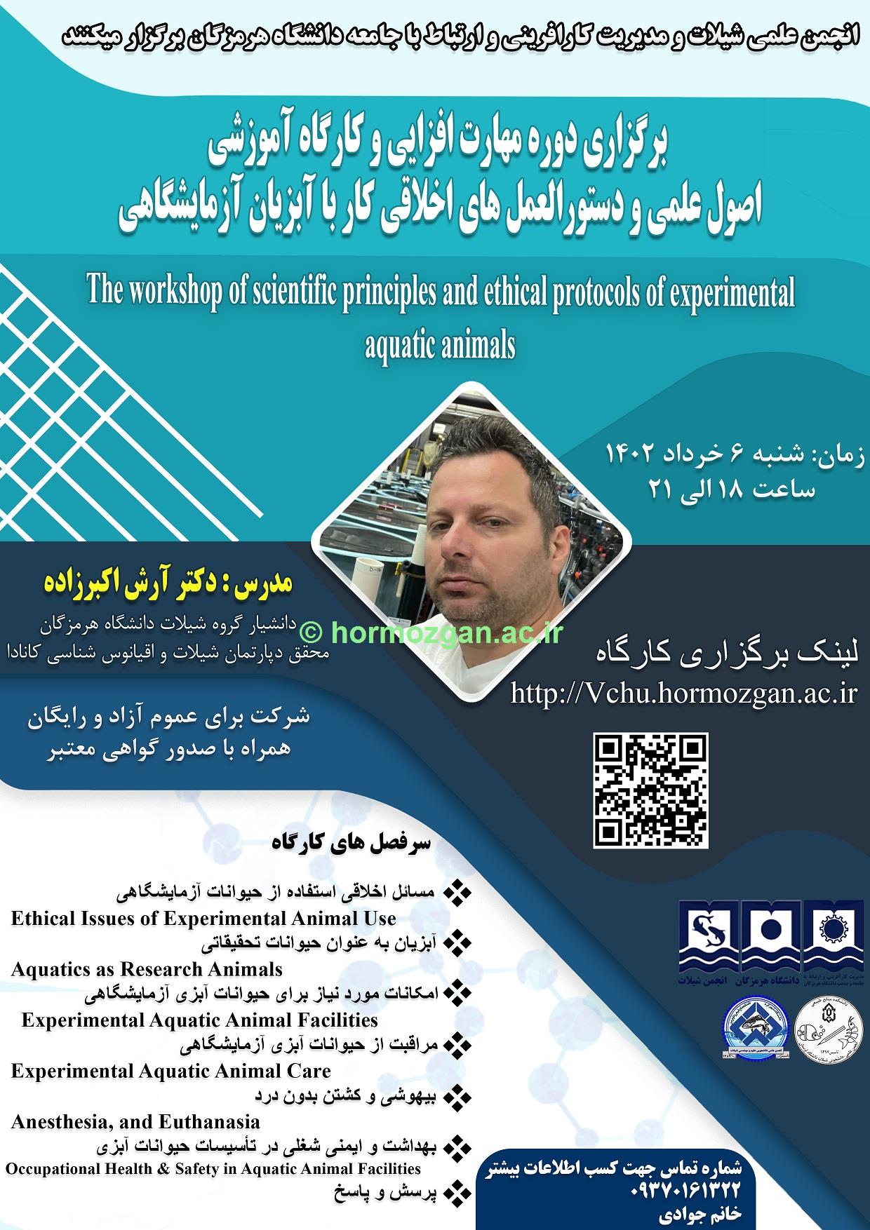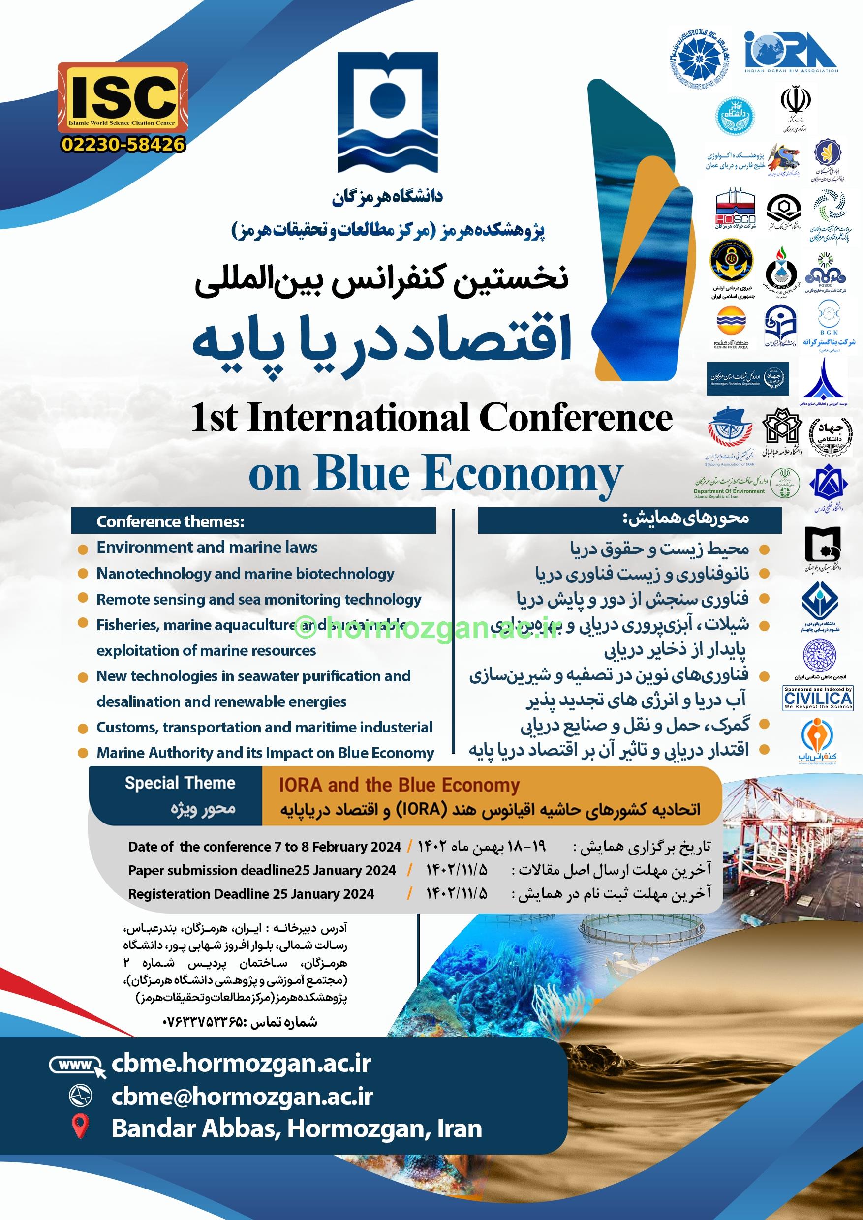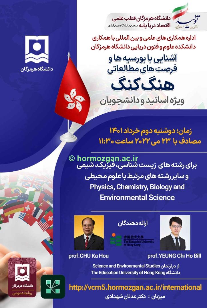 برای رشته های  زیست شناسی، فیزیک، شیمی و سایر رشته های مرتبط با علوم محیطی (Physics, Chemistry, Biology and Environmental Science) لین همایش بین المللی علوم دریایی با رویکرد نوآوری در اکوسیستم های آبی با تکیه بر اقتصاد دریا پایه نخستین رویداد علمی مشترک دانشگاه هرمزگان و دانشگاه UMT مالزی با همراهی علمی سرکارخانم دکتر مهرناز فرزین‌گهر و جناب آقای دکتر عدنان شهدادی (اعضای هیات علمی دانشکده علوم و فنون دریایی دانشگاه) کارگاه آموزشی برگزاری دوره مهارت افزایی اصول علمی و دستورالعمل های  اخلاقی کار با آبزیان آزمایشگاهی شست تخصصی صید غیرمجاز نشصت تخصصی صید غیرمجاز زمان: سه شنبه 9 خرداد ساعت:13-11:30 ثبت نام در سامانه vchu.hormozgan.ac.ir برگزاری کارگاه آموزشی کاربردهای نرم افزار odv در علوم اقیانوسی نخستین کنفرانس بین المللی اقتصاد دریا پایه یازدهمین کنفرانس ماهی شناسی ایران به میزبانی دانشگاه هرمزگان