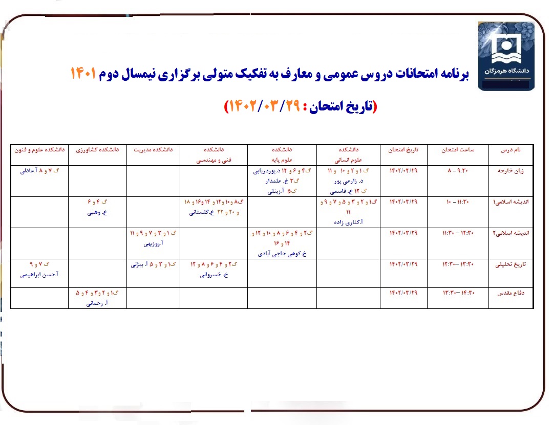 برنامه امتحانات دروس عمومی و معارف به تفکیک متولی برگزاری نیمسال دوم 1402-1401(تاریخ امتحان 1402/03/29)