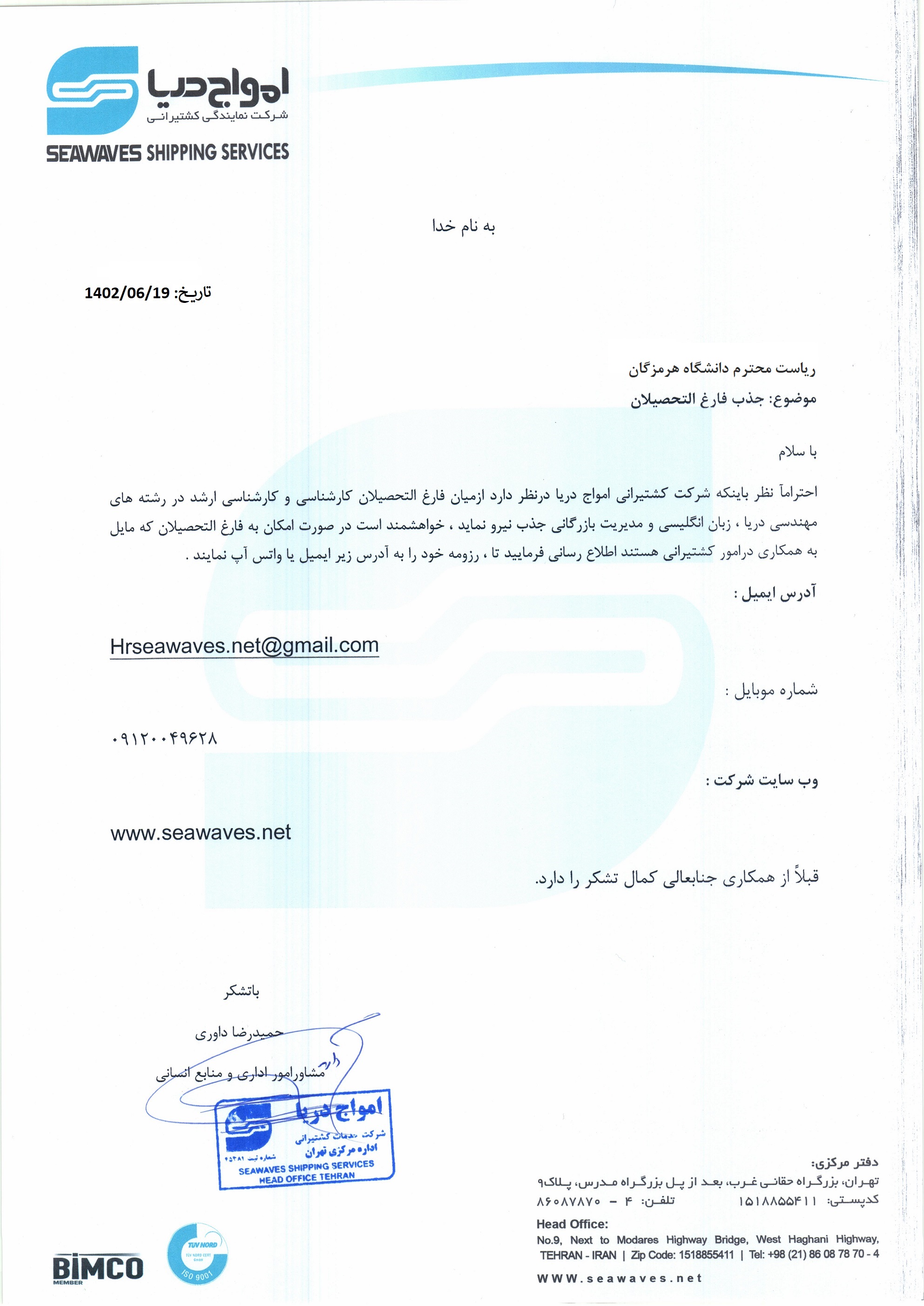 اطلاعیه جذب فارغ التحصیلان در شرکت کشتیرانی امواج دریا