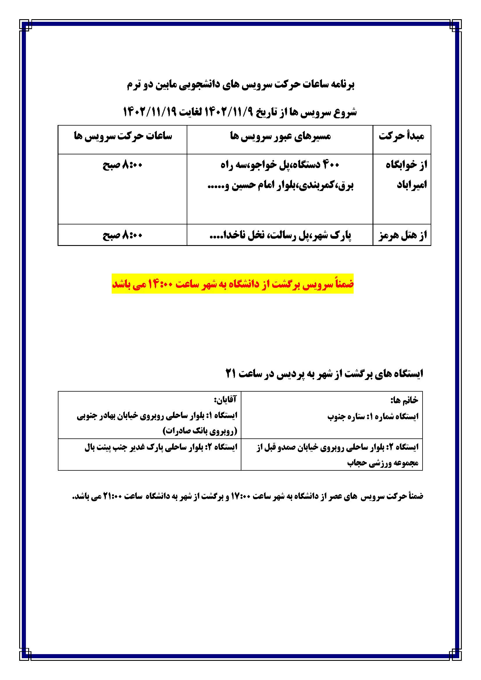 برنامه ساعات حرکت سرویس های دانشجویی مابین دو ترم