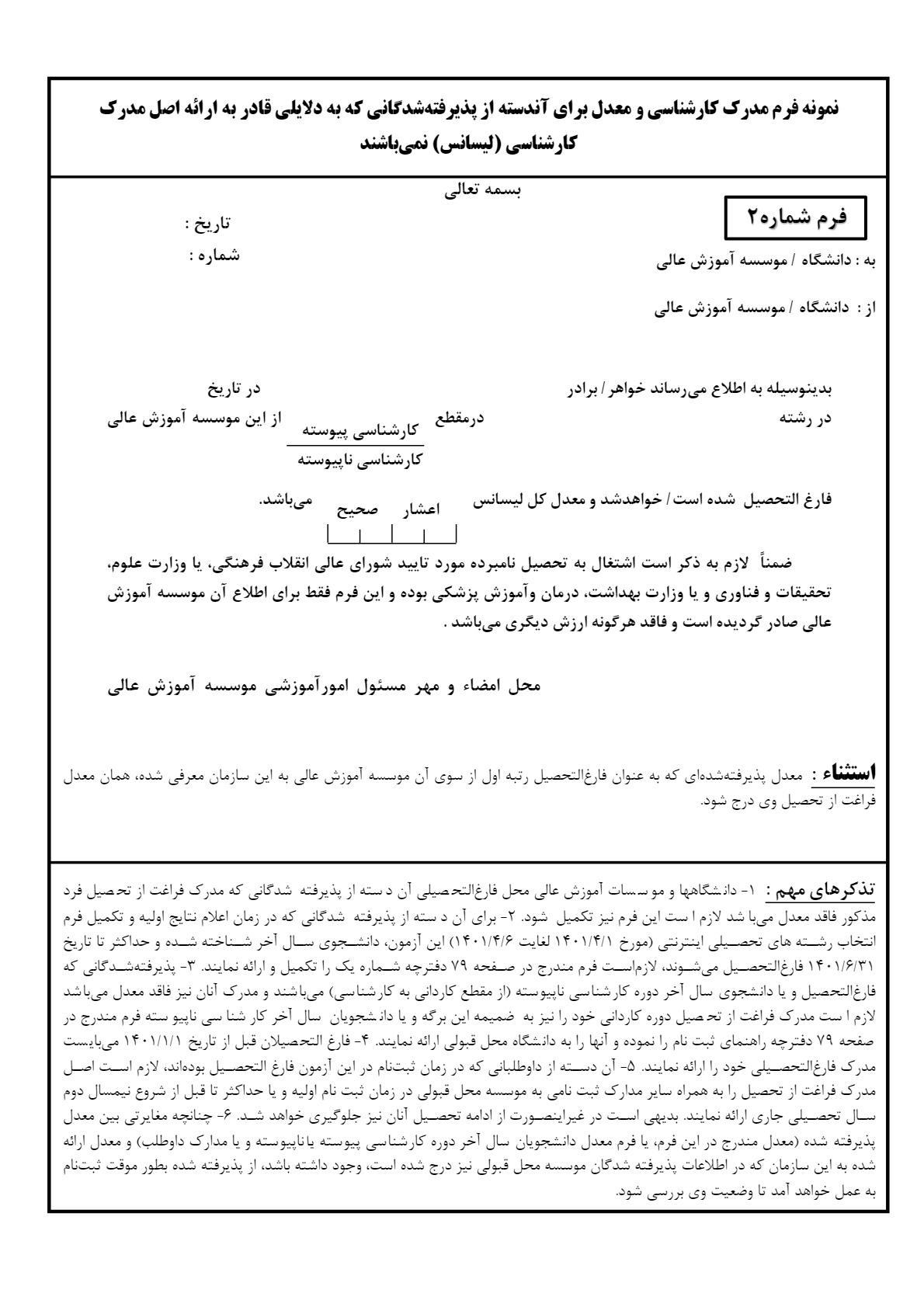 تبصره: پذیرفته شدگانی که به دلیلی قادر به ارائه اصل مدرک کارشناسی (لیسانس) نمی باشند، لازم است اصل گواهی تأیید شده توسط دانشگاه یا مؤسسه آموزش عالی محل اخذ مدرک کارشناسی (لیسانس) با محتوای فرم شماره ٢ پیوست را ارائه نمایند که در آن قید شده باشد اشتغال به تحصیل نامبرده مورد تأیید وزارت علوم، تحقیقات و فنّاوری یا وزارت بهداشت، درمان و آموزش پزشکی و یا شورای عالی انقلاب فرهنگی می باشد.  طبق ضوابط در صورت عدم ارائه نسخه کاغذی هر یک از این فرم ها،  ثبت نام داوطلب نهایی نخواهد بود.