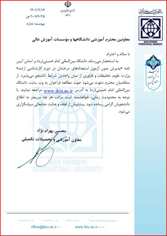 فراخوان پذیرش دانشجو به شیوه بدون آزمون در (استعداد درخشان) برای سال تحصیلی4031-1402دانشگاه امام خمینی