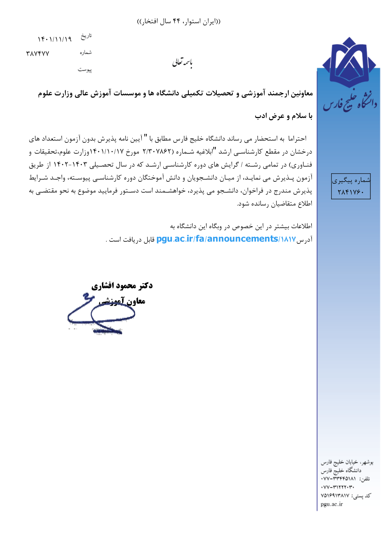 فراخوان پذیرش دانشجو به شیوه بدون آزمون در (استعداد درخشان) برای سال تحصیلی4031-1402دانشگاه خلیج فارس